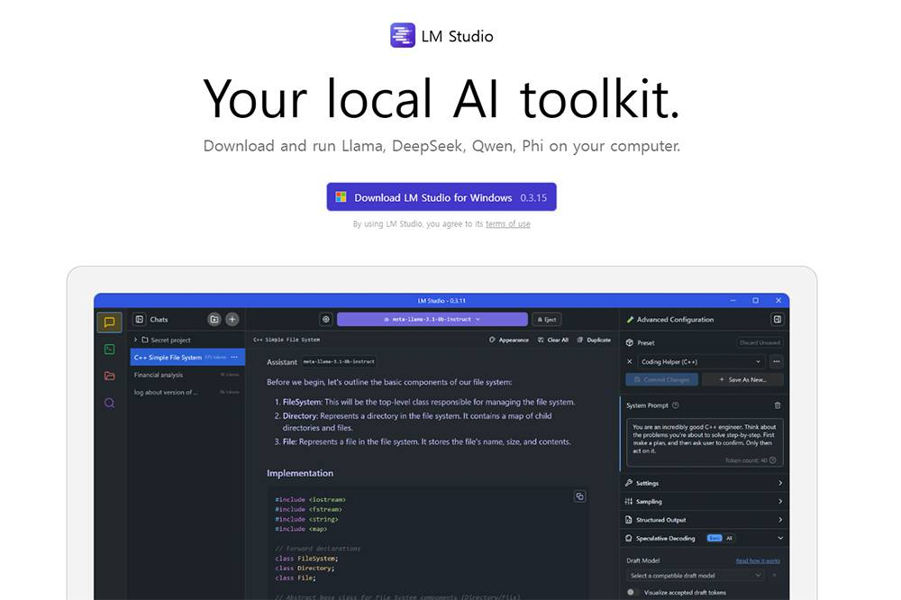 - 설치: LM Studio 공식 웹사이트에서 소프트웨어를 다운로드하고 설치.